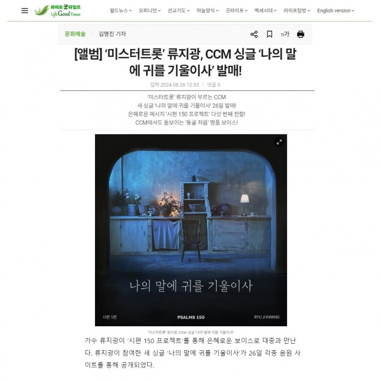 [기사] ‘미스터트롯’ 류지광, CCM 싱글 ‘나의 말에 귀를 기울이사’ 발매!(라이프굿타임즈)