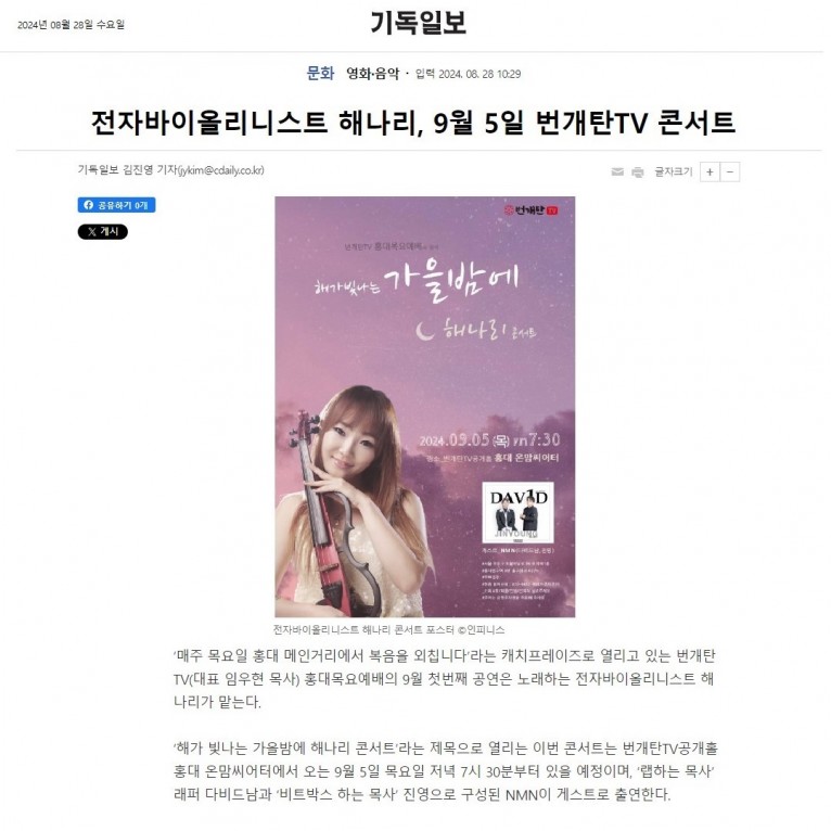 뮤직타임 [기사] 전자바이올리니스트 해나리, 9월 5일 번개탄TV 콘서트(기독일보)