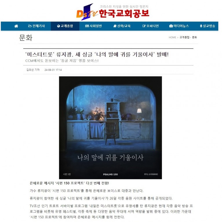 뮤직타임 [기사] ‘미스터트롯’ 류지광, 새 싱글 ‘나의 말에 귀를 기울이사’ 발매!(한국교회공보)