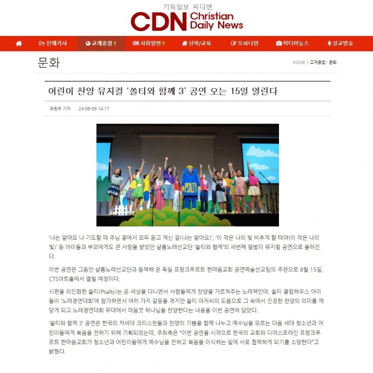 [기사] 어린이 찬양 뮤지컬 ‘쏠티와 함께 3’ 공연 오는 15일 열린다(기독일보 씨디엔)
