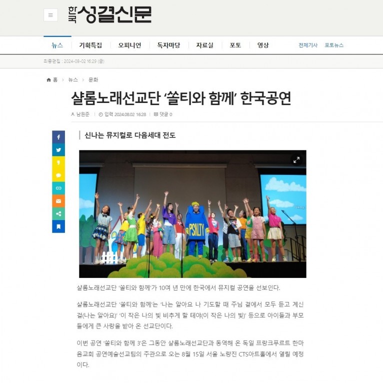 뮤직타임 [기사] 샬롬노래선교단 ‘쏠티와 함께’ 한국공연(한국성결신문)
