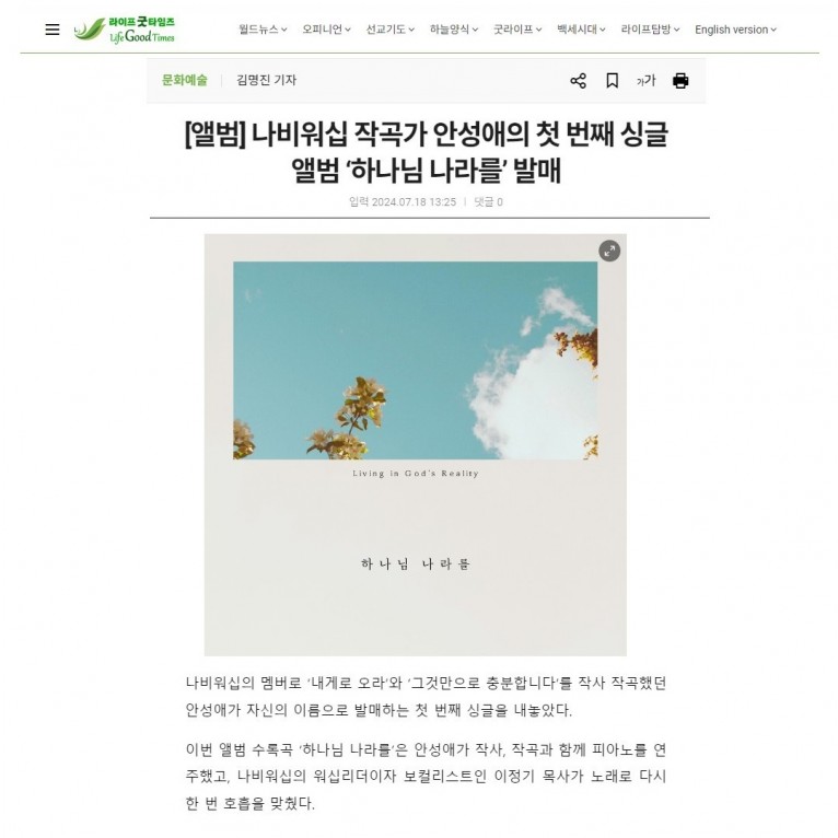 [기사] 나비워십 작곡가 안성애의 첫 번째 싱글 앨범 ‘하나님 나라를’ 발매(라이프굿타임즈)