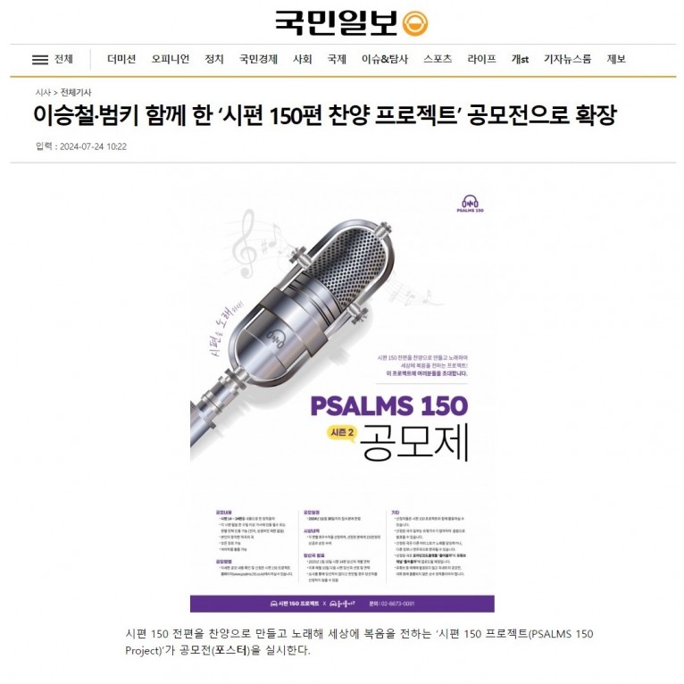 [기사] 이승철·범키 함께 한 ‘시편 150편 찬양 프로젝트’ 공모전으로 확장(국민일보)