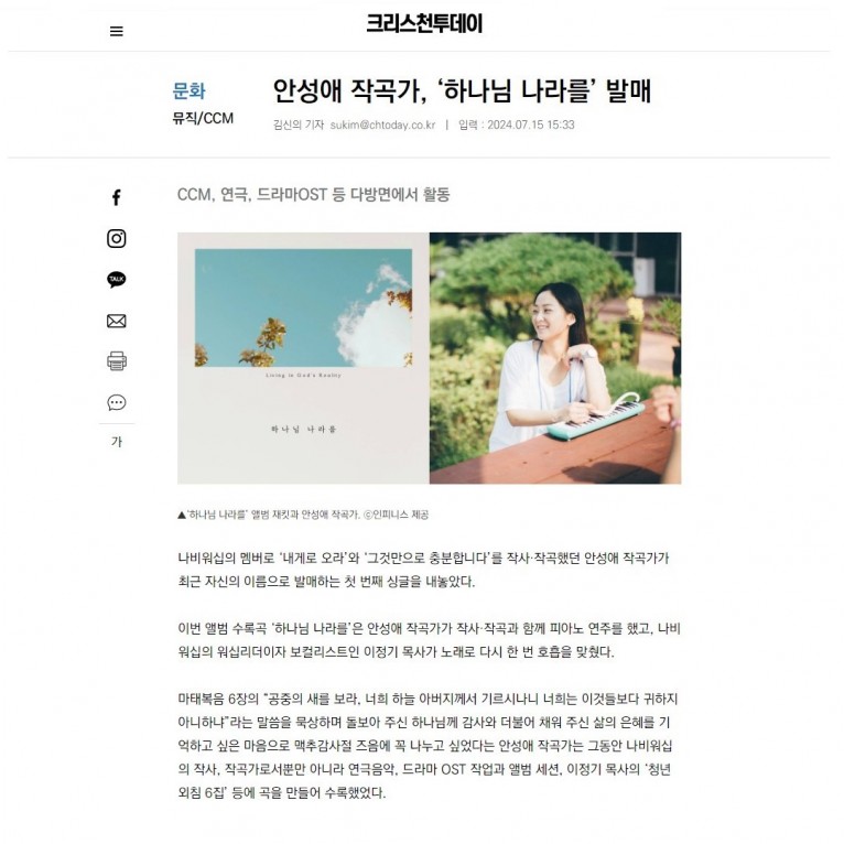 [기사] 안성애 작곡가, ‘하나님 나라를’ 발매(크리스천투데이)