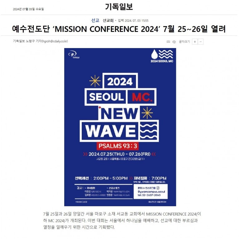 [기사] 예수전도단 'MISSION CONFERENCE 2024' 7월 25~26일 열려(기독일보)