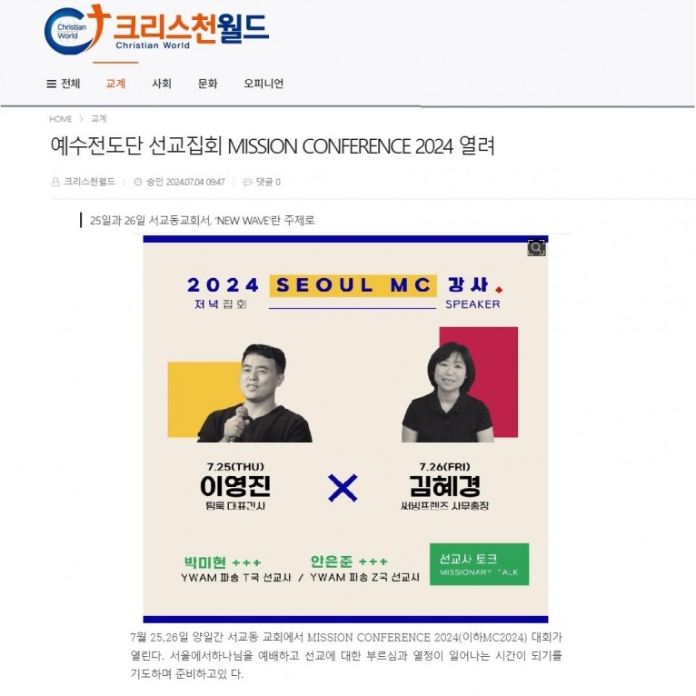 뮤직타임 [기사] 예수전도단 선교집회 MISSION CONFERENCE 2024 열려(크리스천월드)