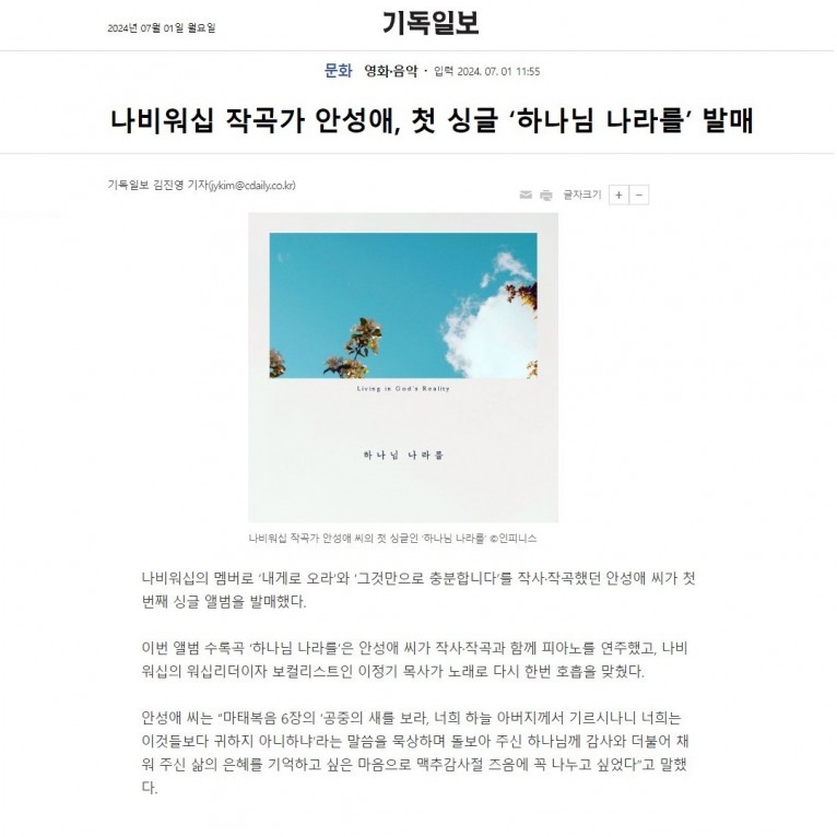 [기사] 나비워십 작곡가 안성애, 첫 싱글 ‘하나님 나라를’ 발매(기독일보)