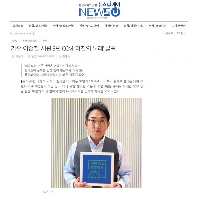 [기사] 가수 이승철, 시편 3편 CCM ‘아침의 노래’ 발표(뉴스제이)