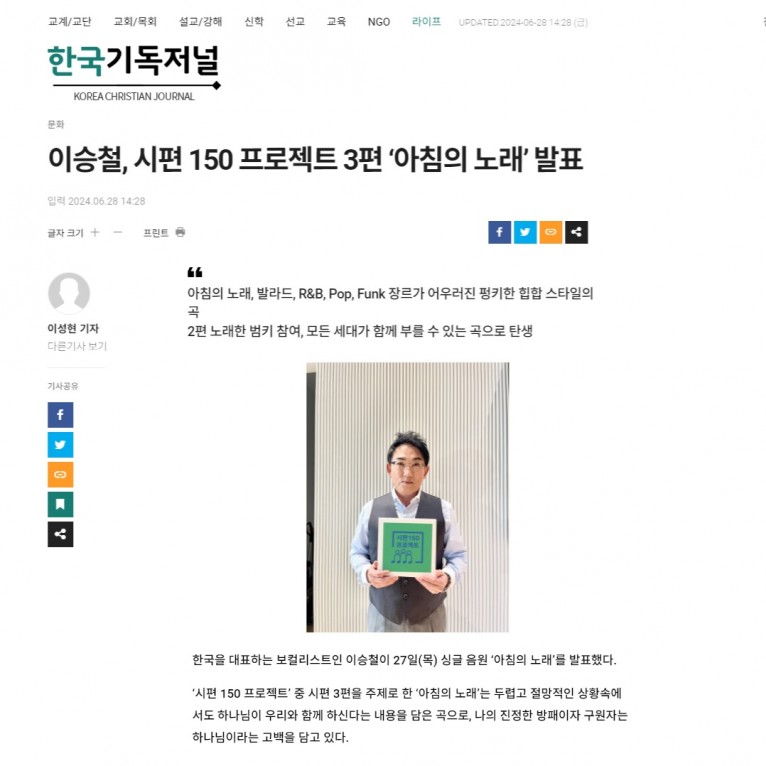 [기사] 이승철, 시편 150 프로젝트 3편 ‘아침의 노래’ 발표(한국기독저널)