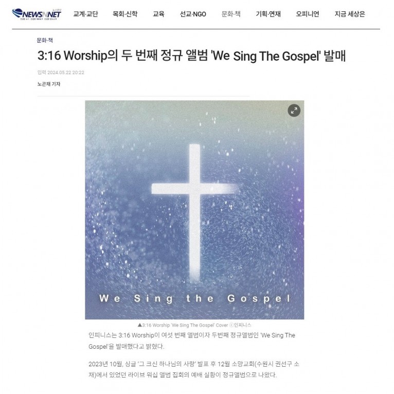 뮤직타임 [기사] 3:16 Worship의 두 번째 정규 앨범 'We Sing The Gospel' 발매(뉴스앤넷)