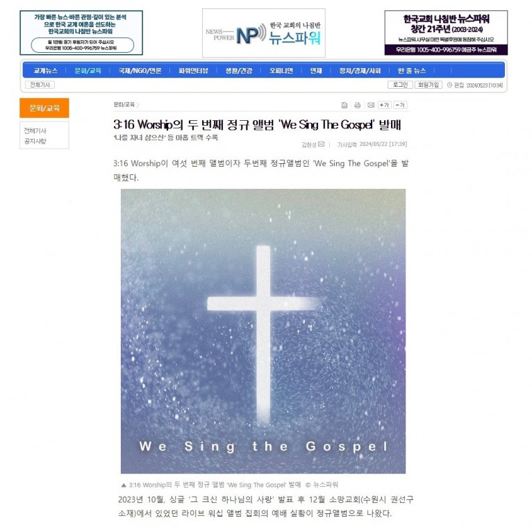 [기사] 3:16 Worship의 두 번째 정규 앨범 'We Sing The Gospel' 발매(뉴스파워)
