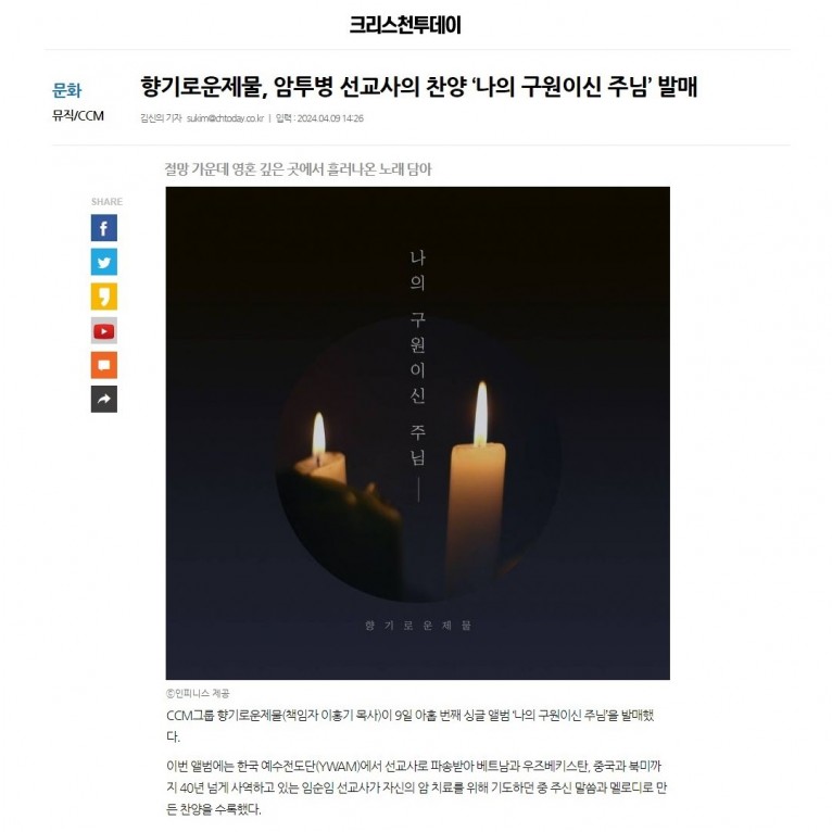 [기사] 향기로운제물, 암투병 선교사의 찬양 ‘나의 구원이신 주님’ 발매(크리스천투데이)
