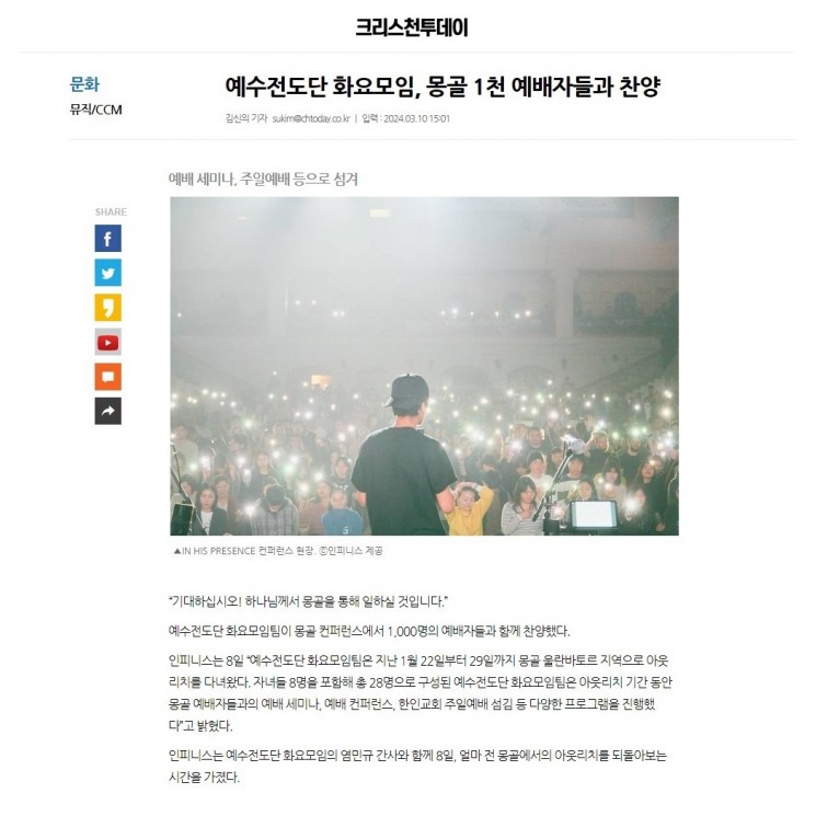 뮤직타임 [기사_인터뷰] 예수전도단 화요모임, 몽골 1천 예배자들과 찬양(크리스천투데이)