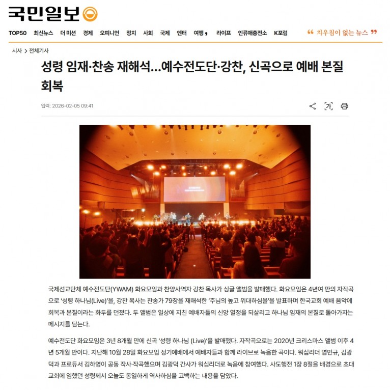 [기사] 성령 임재·찬송 재해석…예수전도단 신곡으로 예배 본질 회복(국민일보)