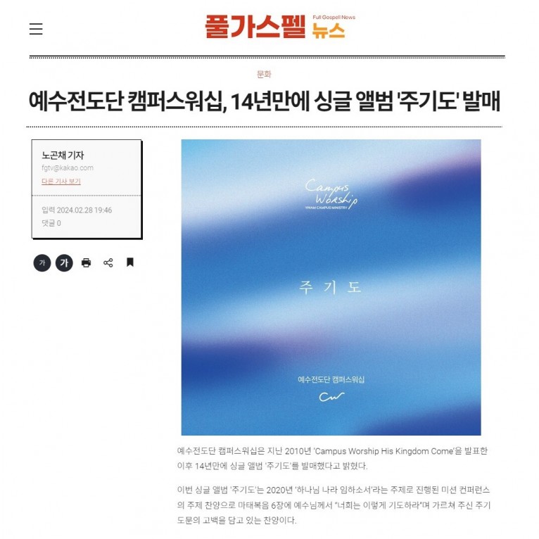 뮤직타임 [기사] 예수전도단 캠퍼스워십, 14년만에 싱글 앨범 '주기도' 발매(풀가스펠뉴스)