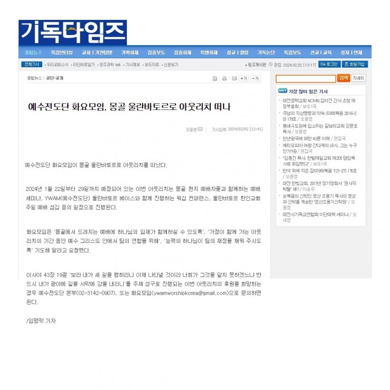 뮤직타임 [기사] 예수전도단 화요모임, 몽골 울란바토르로 아웃리치 떠나(기독타임즈)