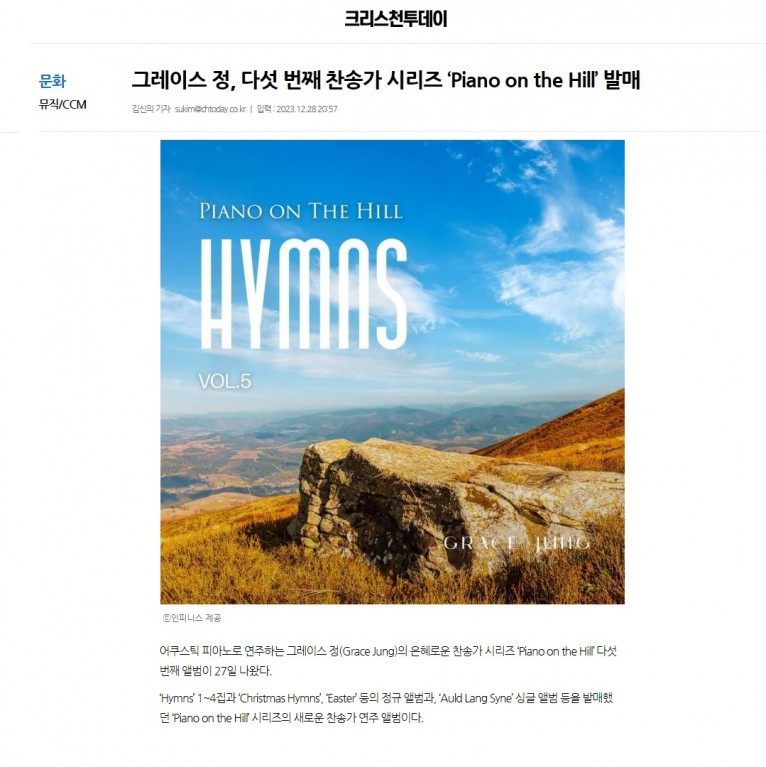 뮤직타임 [기사] 그레이스 정, 다섯 번째 찬송가 시리즈 ‘Piano on the Hill’ 발매(크리스천투데이)