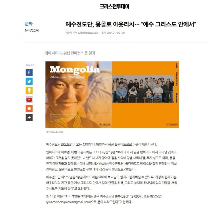 뮤직타임 [기사] 예수전도단, 몽골로 아웃리치… “예수 그리스도 안에서”(크리스천투데이)