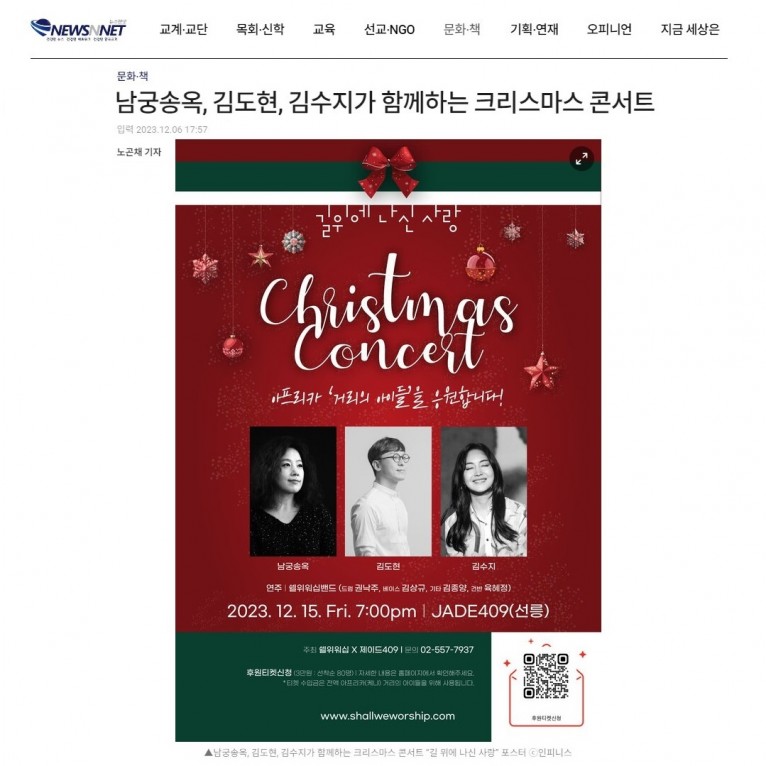 뮤직타임 [기사] 남궁송옥, 김도현, 김수지가 함께하는 크리스마스 콘서트(뉴스앤넷)