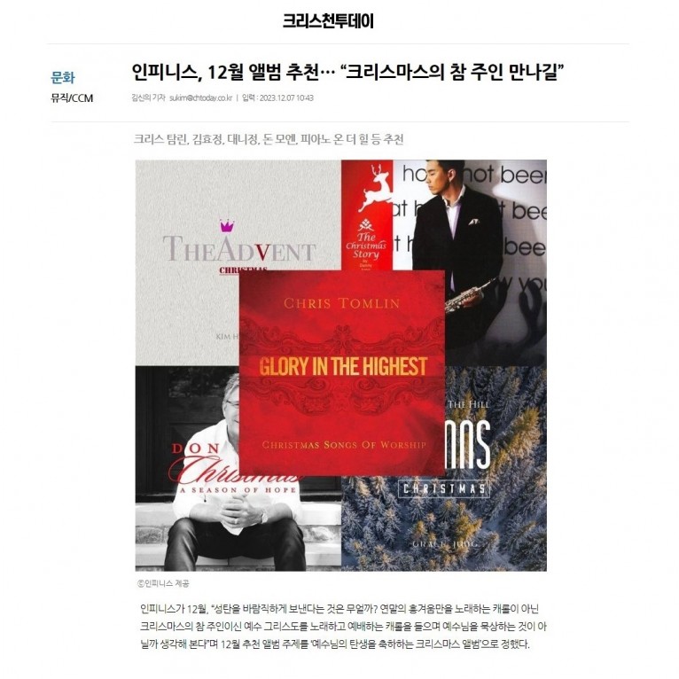 인피니스가 추천한 앨범은 크리스 탐린의 ‘Glory In The Highest: Christmas Songs of Worship(CD)’, 김효정의 ‘The Advent [EP](음원)’, 대니 정의 ‘The Christmas Story(CD)’, 돈 모엔의 ‘Christmas: A Season of Hope(CD)’, 피아노 온 더 힐의 ‘Christmas Hymns(음원)’이다.