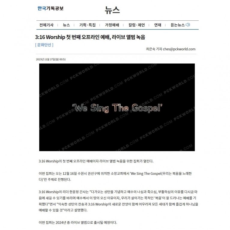 [기사] 3:16 Worship 첫 번째 오프라인 예배, 라이브 앨범 녹음 (한국기독공보)