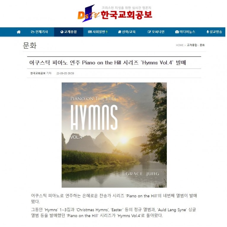 뮤직타임 [기사] 어쿠스틱 피아노 연주 Piano on the Hill 시리즈 'Hymns Vol.4' 발매(한국교회공보)