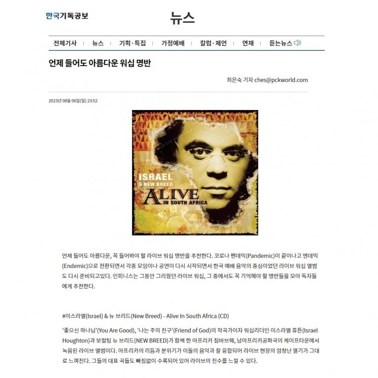 뮤직타임 [기사] 언제 들어도 아름다운 워십 명반(한국기독공보)