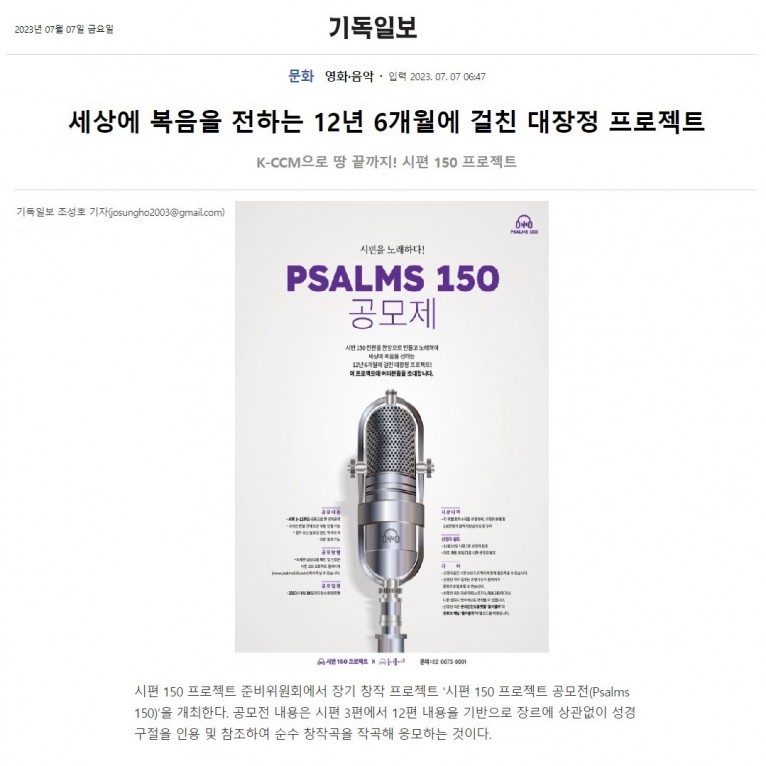 시편 150 프로젝트 준비위원회에서 장기 창작 프로젝트 ‘시편 150 프로젝트 공모전(Psalms 150)‘을 개최한다. 공모전 내용은 시편 3편에서 12편 내용을 기반으로 장르에 상관없이 성경 구절을 인용 및 참조하여 순수 창작곡을 작곡해 응모하는 것이다.