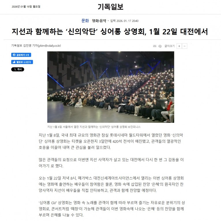[기사] 지선과 함께하는 ‘신의악단’ 싱어롱 상영회, 1월 22일 대전에서(기독일보)