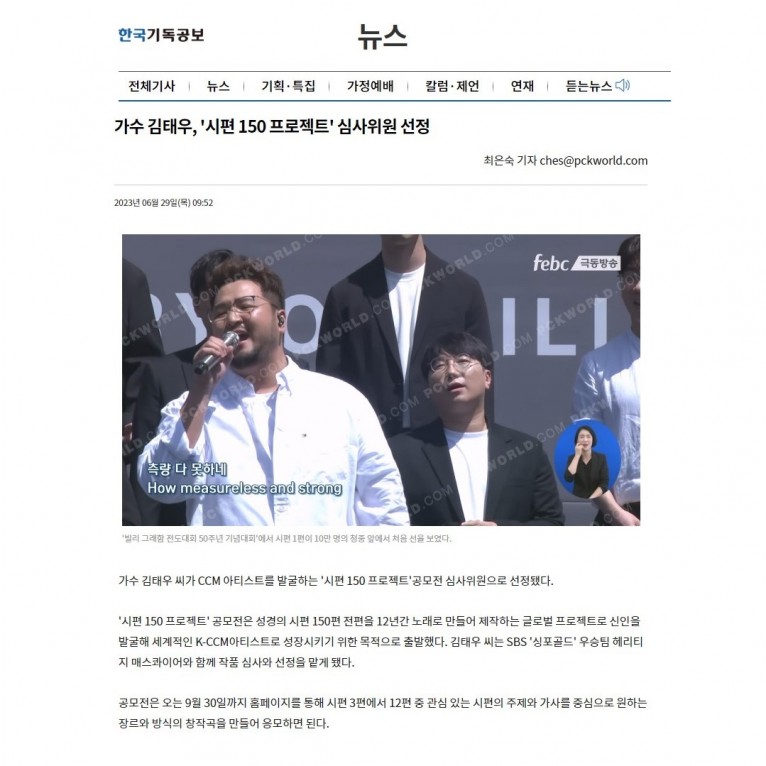 뮤직타임 [기사] 가수 김태우, '시편 150 프로젝트' 심사위원 선정(한국기독공보)