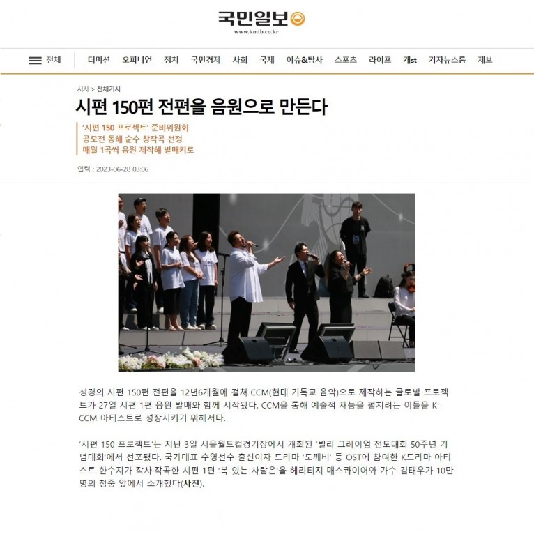 ‘시편 150 프로젝트’는 지난 3일 서울월드컵경기장에서 개최된 ‘빌리 그레이엄 전도대회 50주년 기념대회’에서 선포됐다. 국가대표 수영선수 출신이자 드라마 ‘도깨비’ 등 OST에 참여한 K드라마 아티스트 한수지가 작사·작곡한 시편 1편 ‘복 있는 사람은’을 헤리티지 매스콰이어와 가수 김태우가 10만명의 청중 앞에서 소개했다.