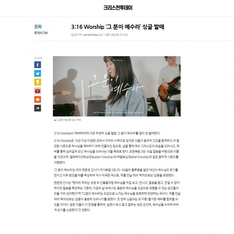 [기사] 3:16 Worship ‘그 분이 예수라’ 싱글 발매(크리스천투데이)