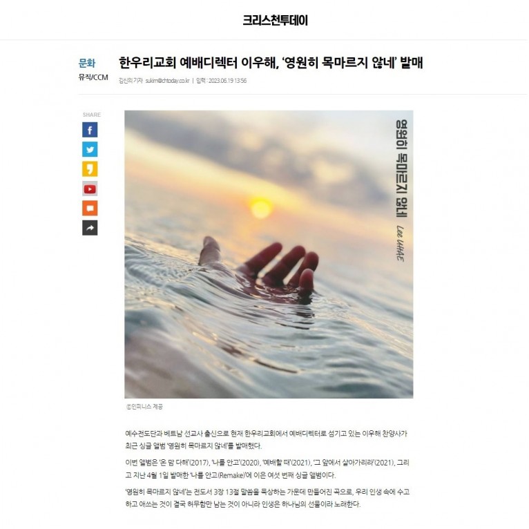 [기사] 한우리교회 예배디렉터 이우해, ‘영원히 목마르지 않네’ 발매(크리스천투데이)