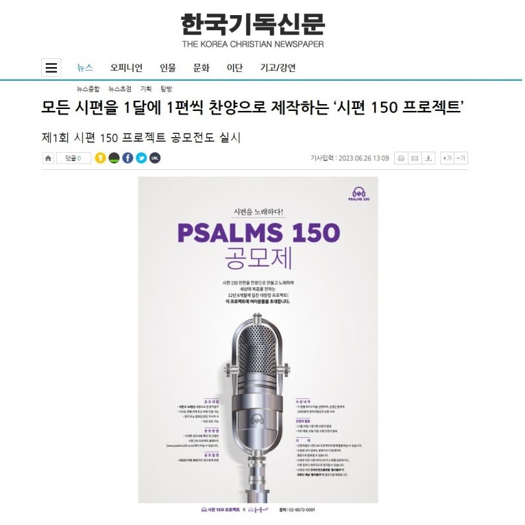 [기사] 모든 시편을 1달에 1편씩 찬양으로 제작하는 ‘시편 150 프로젝트’(한국기독신문)