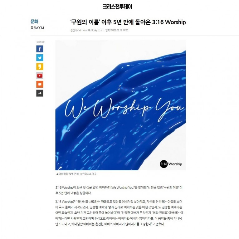 [기사] ‘구원의 이름’ 이후 5년 만에 돌아온 3:16 Worship(크리스천투데이)