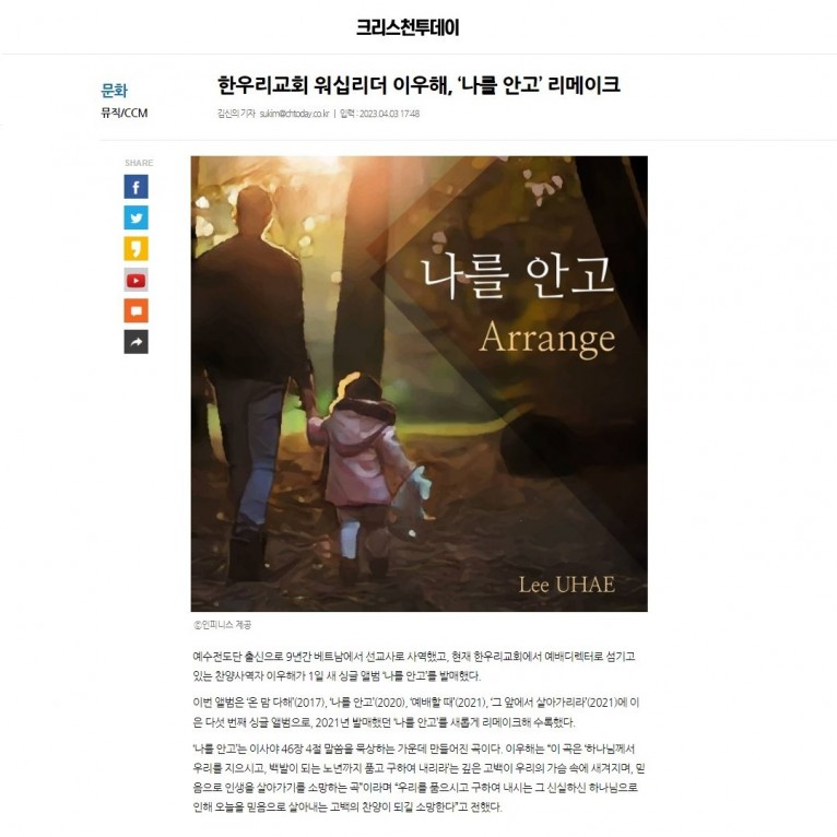 [기사] 한우리교회 워십리더 이우해, ‘나를 안고’ 리메이크(크리스천투데이)
