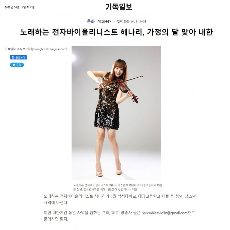 [기사] 노래하는 전자바이올리니스트 해나리, 가정의 달 맞아 내한(기독일보)