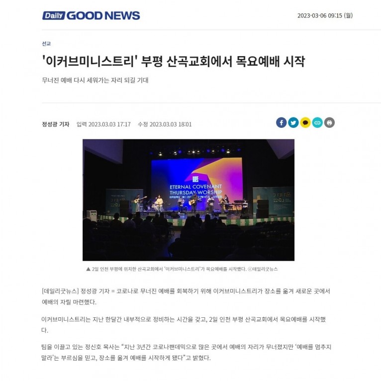 뮤직타임 [기사] '이커브미니스트리' 부평 산곡교회에서 목요예배 시작