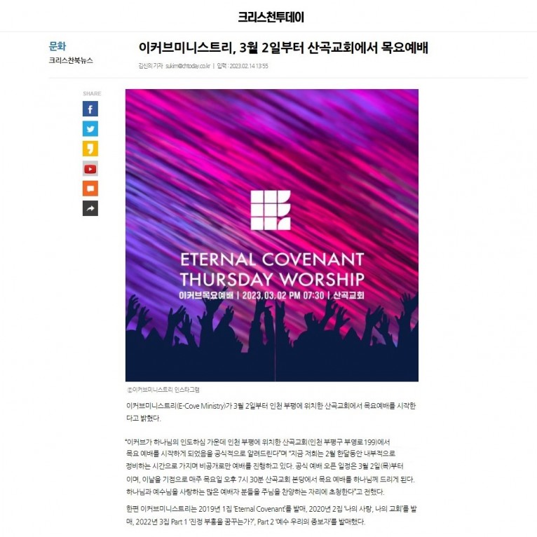 뮤직타임 [기사] 이커브미니스트리, 3월 2일부터 산곡교회에서 목요예배