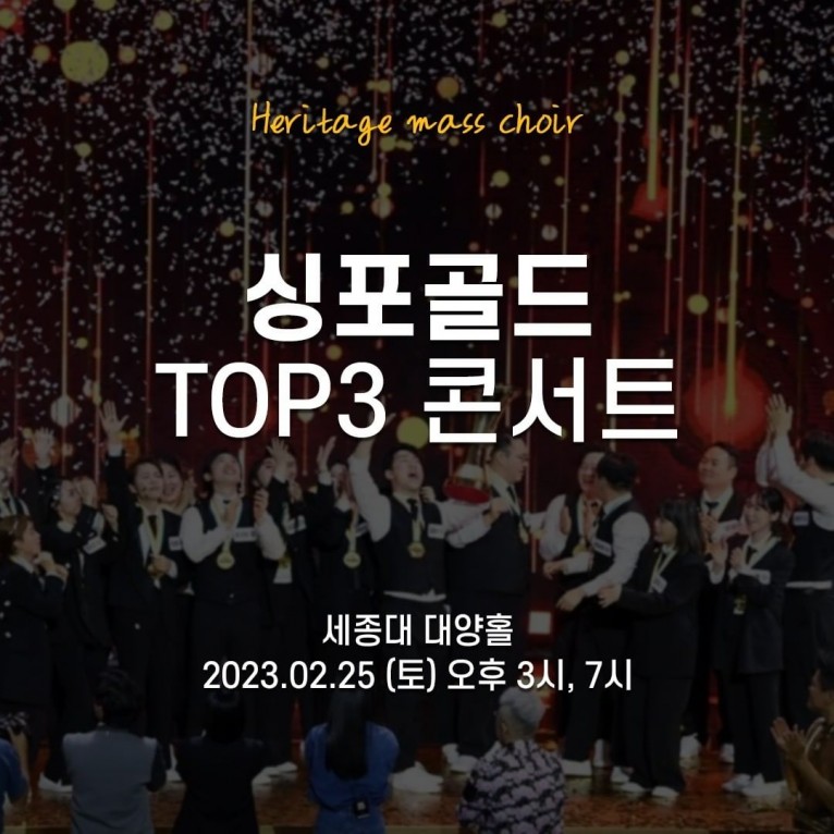 지난해 연말 퍼포먼스 합창단 서바이벌 프로그램 SBS “싱포골드”에서 우승하고, 스페인에서 열린 세계 합창 월드컵(The World Choral Cup 2022)에 출전해 팝&재즈&가스펠 부문 2위와 왕중왕전까지 진출, 그들의 실력을 세계적으로 인정받은 헤리티지 매스콰이어(Heritage Mass Choir)가 SBS 싱포골드 TOP3 콘서트에 참여한다.