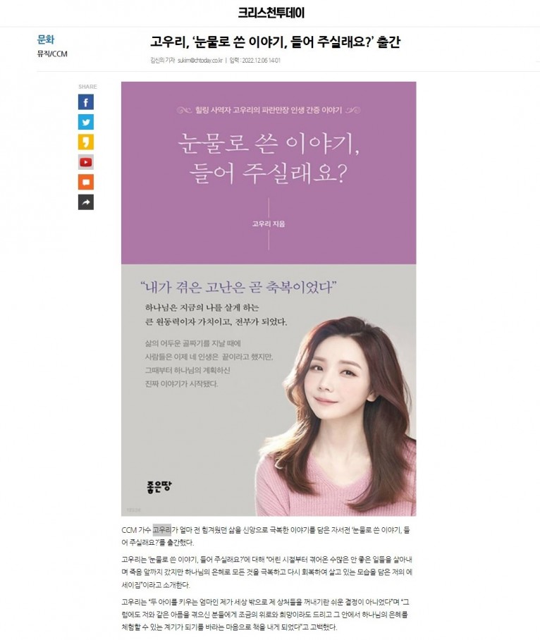 [기사] 고우리, ‘눈물로 쓴 이야기, 들어 주실래요?’ 출간