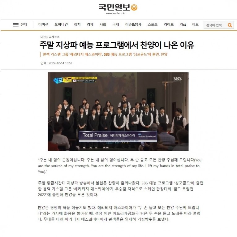주말 황금시간대 지상파 방송에서 불현듯 찬양이 흘러나왔다. SBS 예능 프로그램 ‘싱포골드’에 출연한 블랙 가스펠 그룹 ‘헤리티지 매스콰이어’가 우승팀 자격으로 스페인 합창대회 ‘월드 코랄컵 2022’에 출전해 찬양을 부른 것이다.