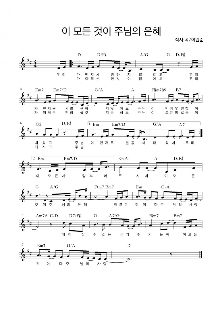 뮤직타임 [악보] 이 모든 것이 주님의 은혜 (All Because of His Grace) (Feat. 이원준) - 사랑의교회 쉐키나…