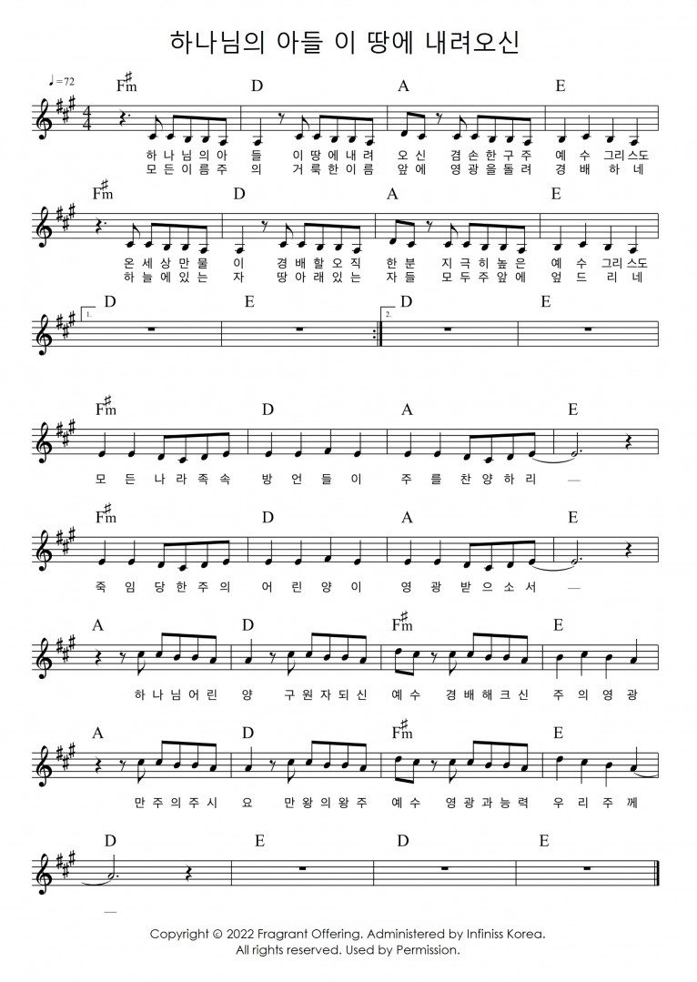 [악보] 하나님의 아들 이 땅에 내려오신 - 향기로운 제물