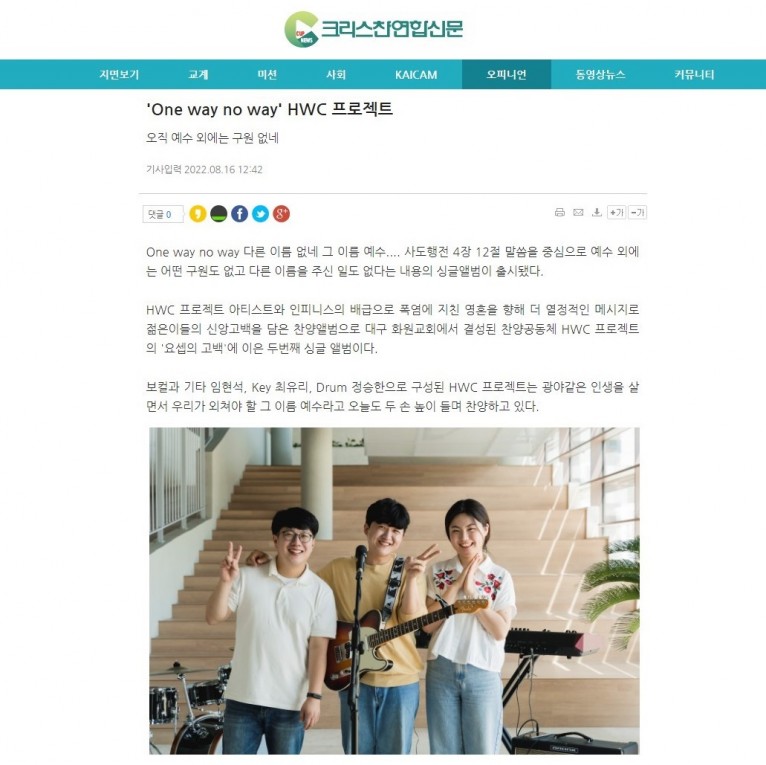 One way no way 다른 이름 없네 그 이름 예수.... 사도행전 4장 12절 말씀을 중심으로 예수 외에는 어떤 구원도 없고 다른 이름을 주신 일도 없다는 내용의 싱글앨범이 출시됐다.