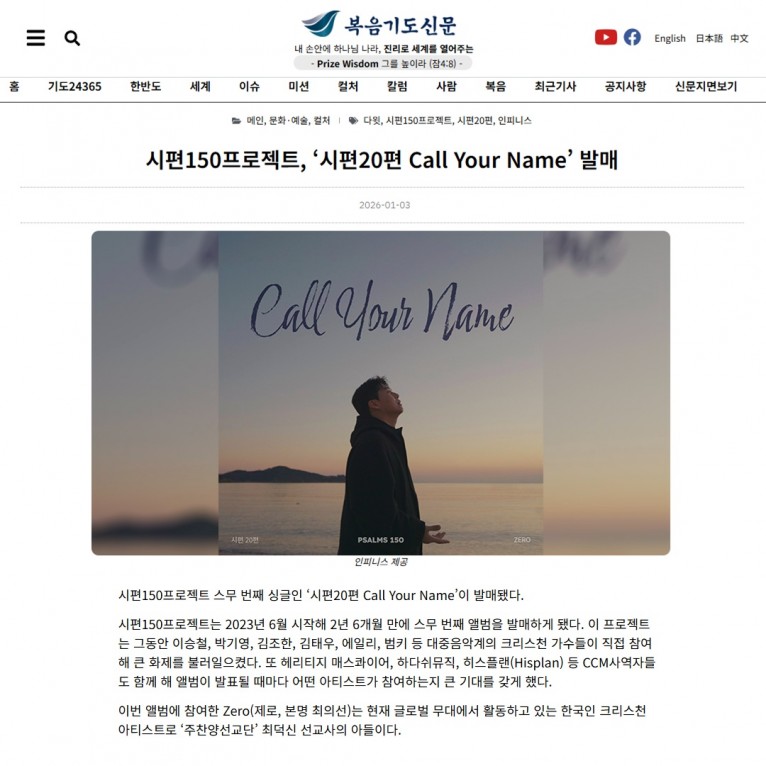 [기사] 시편150프로젝트, ‘시편20편 Call Your Name’ 발매(복음기도신문)