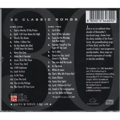 우리나라 경배와 찬양의 50% 이상을 차지하고 있는 마라나타 뮤직의 30주년을 기념한 특별 제작 앨범 " 30 Years of Hope " 출시! ! ! * 총 30곡 수록 & 전곡 가사 수록 * 마라나타 뮤직의 History 소개글 수록 이번에 소개하는 앨범 ‘Maranatha! 30 years of Hope’ 은 마라나타!의 예배 곡을 모아놓은 더블앨범이 다. 마라나타! 뮤직의 30주년을 기념하기 위해 나온 이번 앨범이 이전의 기념음반 [20주년, 25주년]과 다른 점은 예배앨범 [Maranatha! 30 years of hope]과 함께 초창기 마라나타에서 사역했던 CCM 아티스트들의 희귀한 자료를 담은 앨범 [Maranatha! Anthology], 이 두 타이틀의 앨범을 (각각 더블앨범) 함께 출시하여 마라나타 뮤직의 역사를 되새기는데 큰 기여를 하고 있다는 점이다. Disc1의 첫 곡은 요즘 찬양과 경배모임에서 많이 부르고 있는 데이빗 루이스의 곡 ‘경배하리 내 온 맘 다해/You're Worthy Of My Praise’ 이다. 모던 락으로 편곡된 이 곡은 마라나타의 깔끔한 편곡에 여성솔로가 어우러져 모던 워십의 진수를 들려주고 있다. 두 번째 곡은 프레이즈 밴드 1집에 실려 지난 10여 년간 전세계적으로 가장 많이 불리우고 있는 예배 곡 ‘주의 이름 높이며 - Lord, I Life Your Name O High’가 실려있고, 그밖에도 프레이즈 시리즈에 실려 우리에게 잘 알려진 곡들 ‘사모합니다’ ‘감사함으로’ ‘주께 가오니’ ‘주님의 시간에’와 마라나타의 대표 곡이라 할 수 있는 ‘먼저 그 나라’ 그리고, 25주년 기념음반에 담긴 ‘사랑해요 목소리 높여’ ‘나는 주님을 찬양하리라’ 등 우리에게 친숙한 예배 곡들이 가득 담겨있다. 그 외에 프레이즈 밴드와 미국의 남성회복운동 “프라미스 키퍼스 [Promise Keepers]”에 실려 좋은 반응을 얻고 있는 타미 워커(Tommy Walker)의 곡 ‘That's Why We Praise Him’과 ‘Lord, I Believe In You’ 등 요즘 새롭게 발표된 곡들을 포함한 30곡이 이 앨범을 빼곡히 채우고 있다. 30년이란 세월이 말해주듯 마라나타의 음악을 통해 우리는 미국 가스펠의 과거와 현재 미래를 볼 수 있다. 미국에서 CCM의 뿌리 역할을 충실하게 담당하면서 현대적인 스타일의 찬양과 경배를 이끌어 온 마라나타! 뮤직은 전 세계의 그리스도인들에게 찬양과 경배를 통해 소망의 자양분을 전하고 있다. 미국의 CCM을 얘기할 때 마라나타를 떠올리는 것은 그들의 정신과 사역이 끼친 영향이 너무나 크게 자리하고 있기 때문일 것이다.