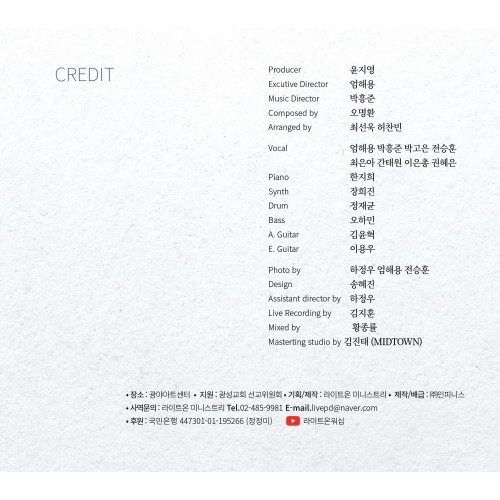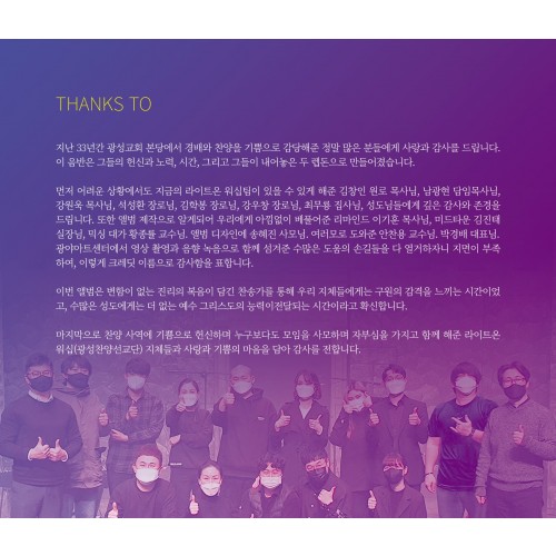 33년간 '광성찬양선교단'으로 사역하던 광성교회 예배찬양팀의 새로운 이름 라이트온 워십의 정규 1집.