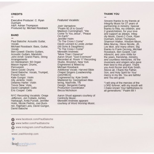 Featured Vocalists: Josh Varnadore: “Psalm 92 (It Is Good)” Madison Cunningham: “We Come To You Jesus”, “Peace On Earth” Jennifer Holm: “To The Cross I Come” David Leonard & Leslie Jordan (All Sons & Daughters): “To The Cross I Come” Meredith Andrews: “More Than I Deserve” Aaron Shust: “God Evermore”